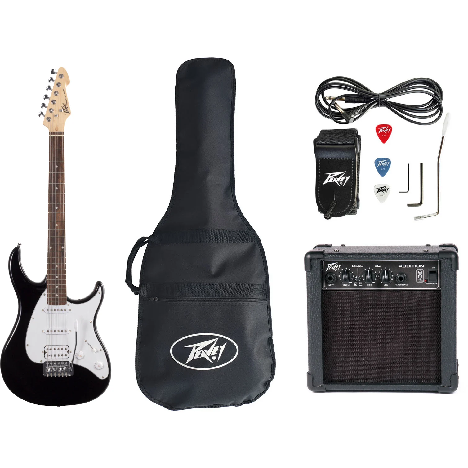 El nuevo Peavey Raptor® Plus JR Stage Pack® está diseñado para que los principiantes jueguen rápidamente. Todo lo necesario para empezar a jugar está incluido; excelente guitarra Raptor Plus, amplificador TransTube® Audition®, funda de nailon, correa, cable y púas.