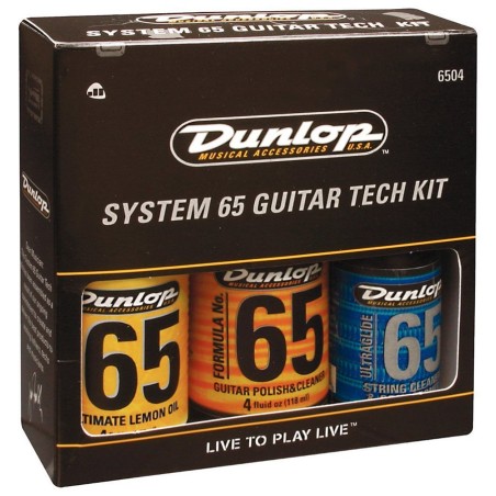 Kit de accesorios de Limpieza de Guitarra Dunlop 6504 System 65 Guitar Tech Kit. Limpieza completa y rápida de tu guitarra eléctrica, acústica o bajo. El kit contiene todo lo necesario para procurar un profunda limpieza y cuidado tanto del cuerpo, el diapasón y las cuerdas de tu instrumento. Alargando la vida útil de su valioso instrumento